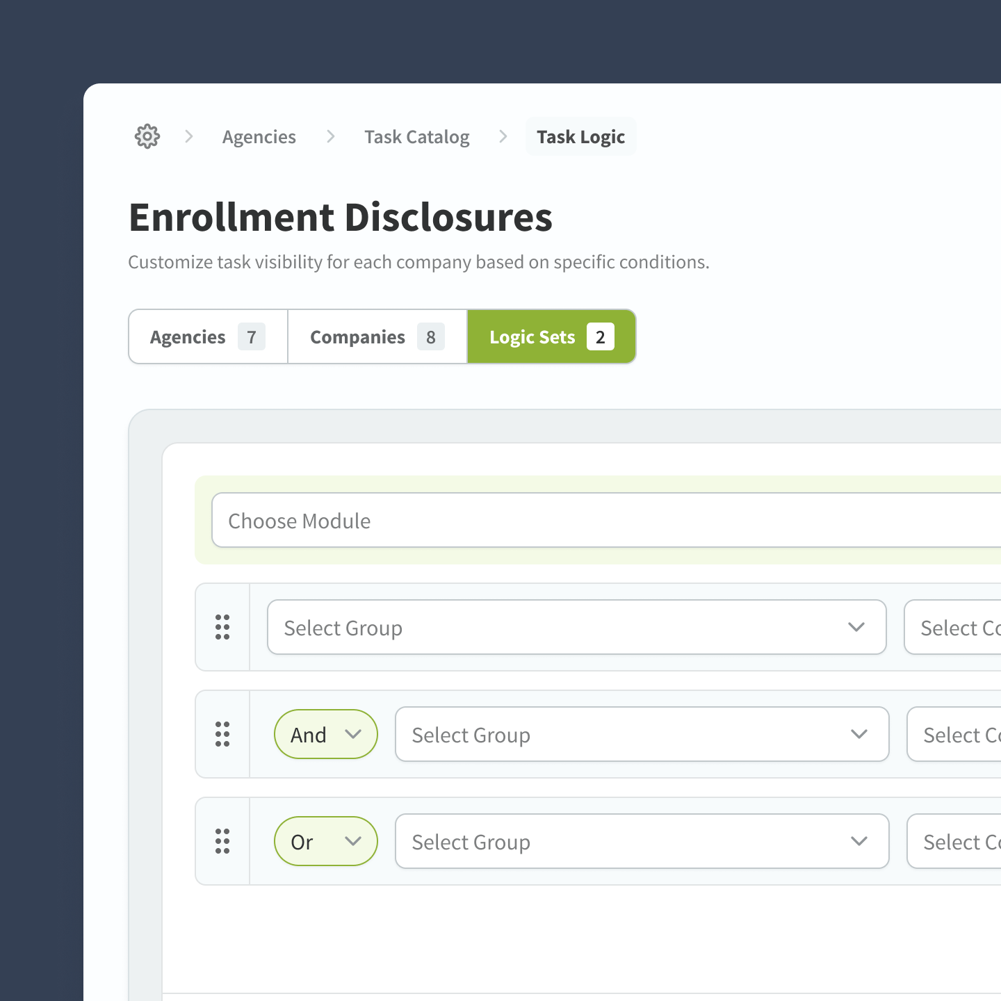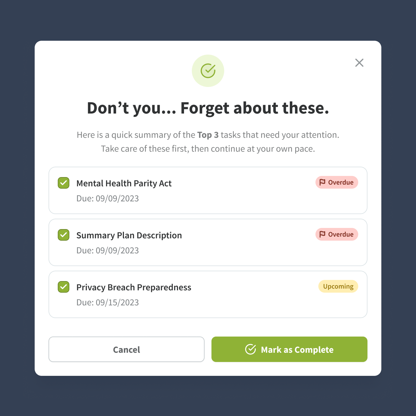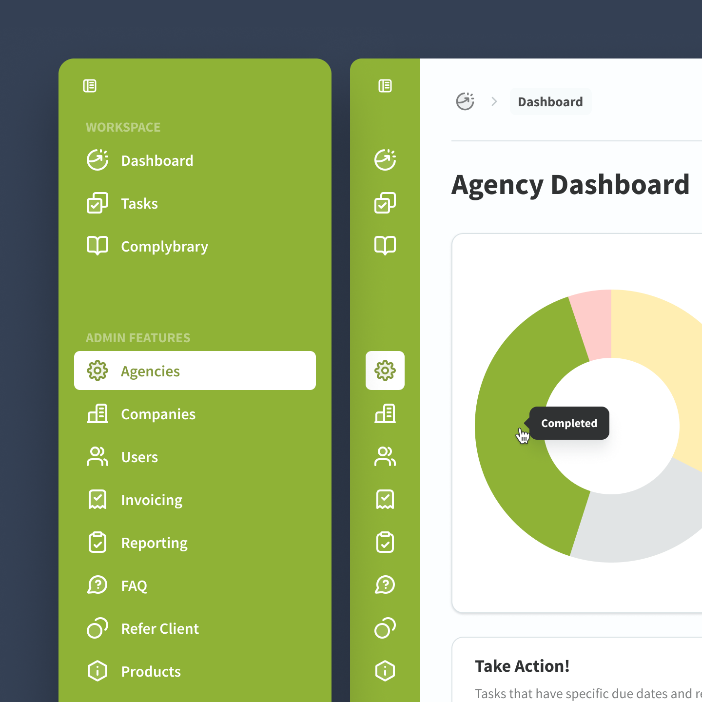 Big Pixel was selected to lead a complete platform re-architecture from the ground up. We replaced the legacy system with a fully custom compliance management platform featuring a dynamic task builder, multi-step onboarding wizards, automated email workflows, and intuitive dashboards that give clients real-time visibility into what's due and when.