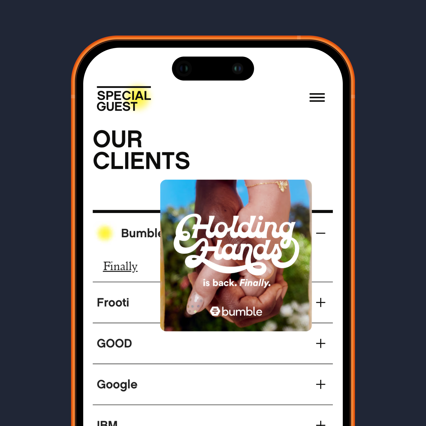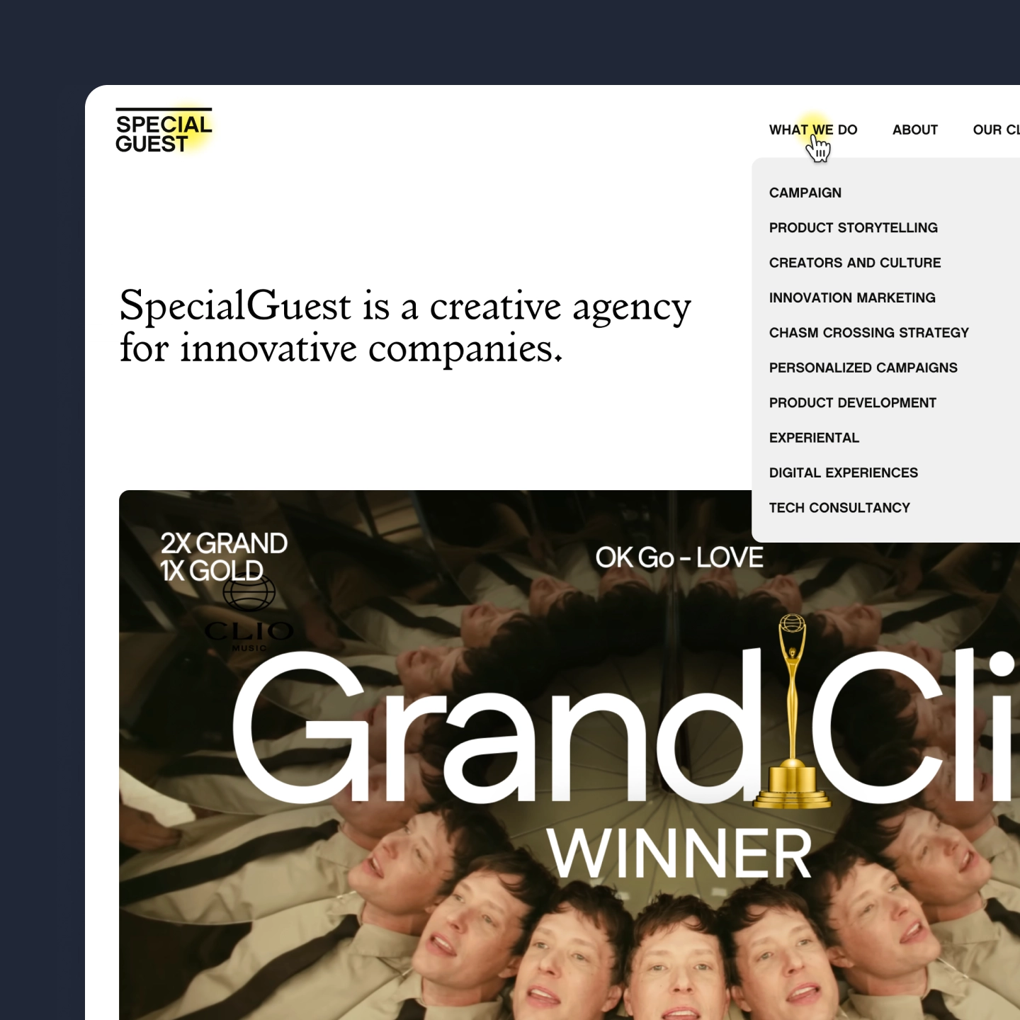 We built the site in Webflow, integrating their CMS so the Special Guest team can add and update work without developer involvement. For the animations, we combined Webflow's native animation tools with custom JavaScript to create fluid, polished interactions that match the agency's creative standards.
